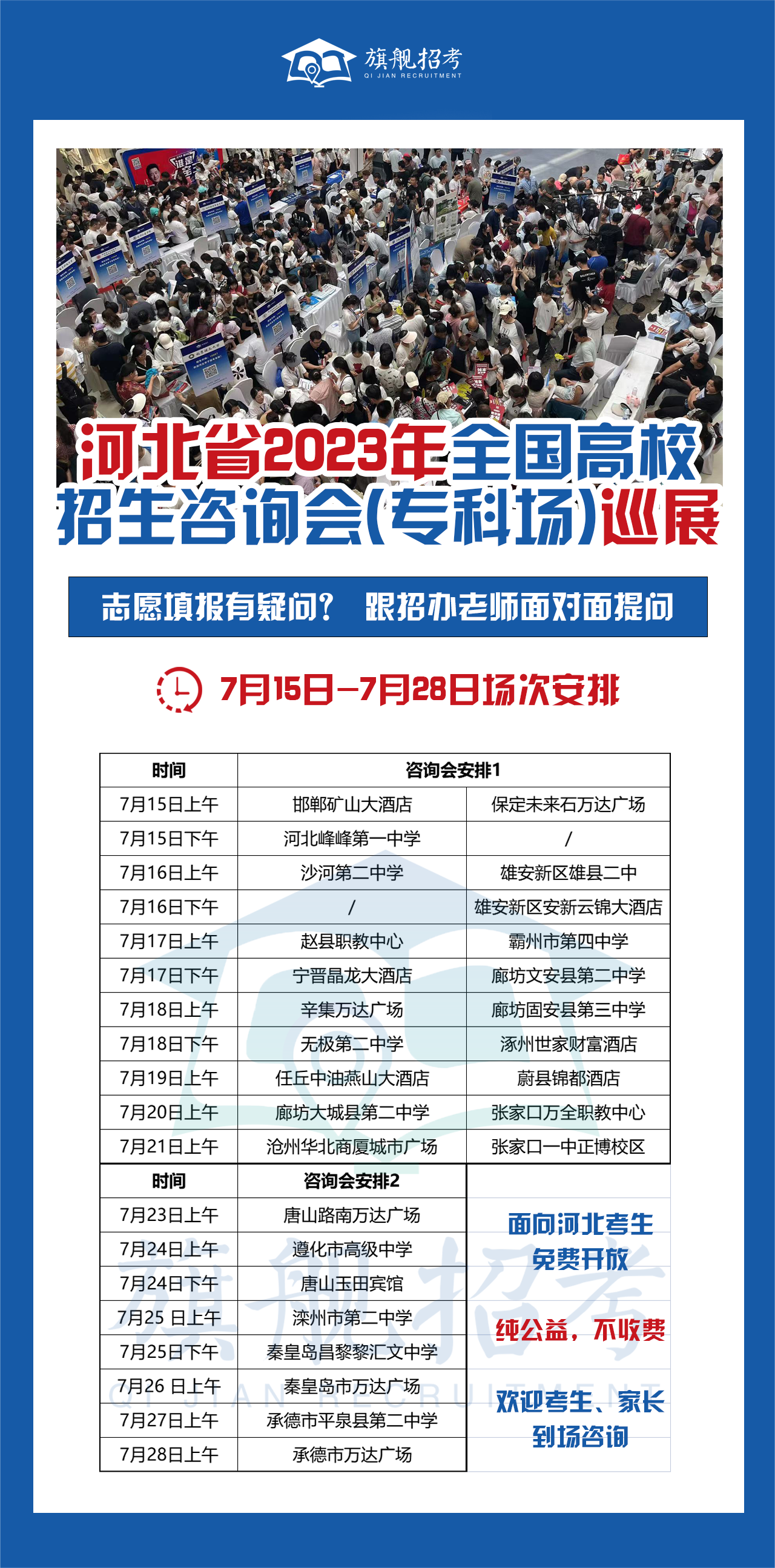 本次咨询会重点邀请全国公办高职院校参与,届时,高校招办负责人将与考生及家长互动交流,讲解志愿填报技巧及高校专业发展趋势、招生计划、历年录取分数、学科特点、专业特色、办学实力等,解答河北考生志愿填报疑问。